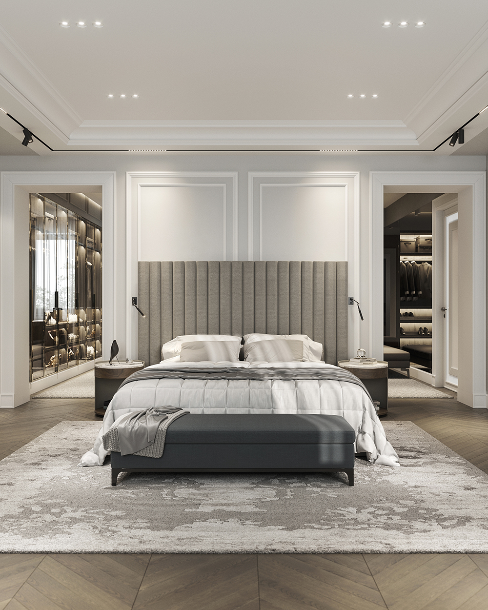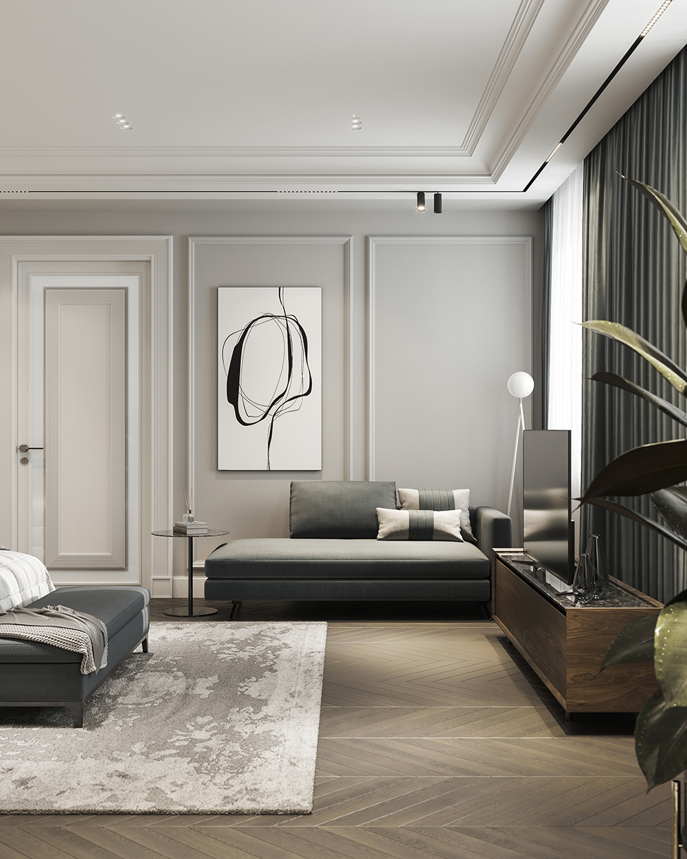 主卧采用柔和的灰色和棕色,