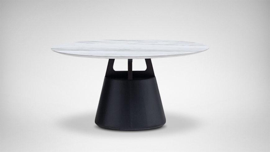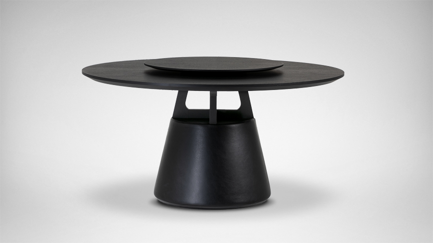 圆形的桌面,圆锥体的桌腿,简约现代。中间的小圆形桌面可自由转动,满足众人就餐的需要。