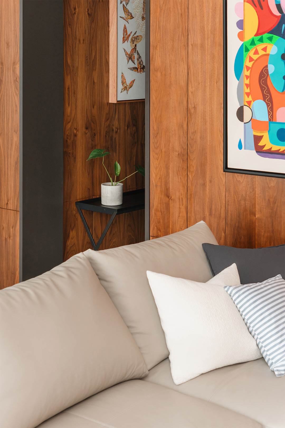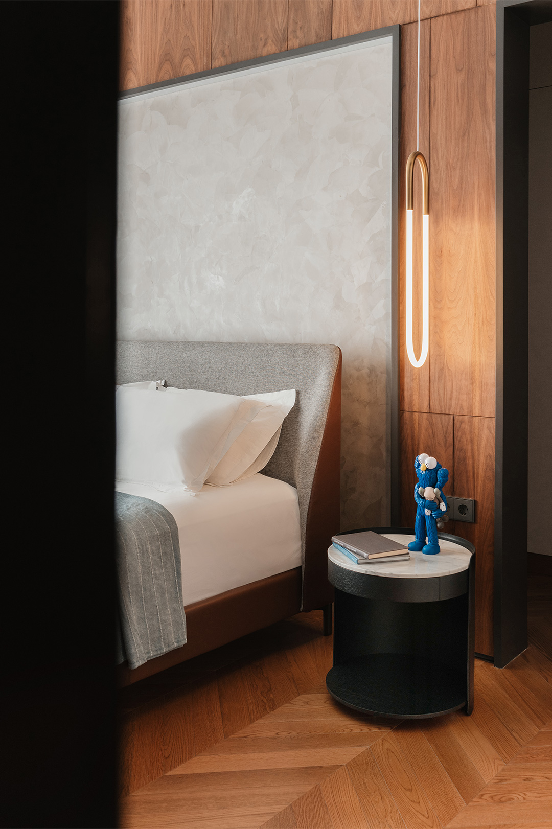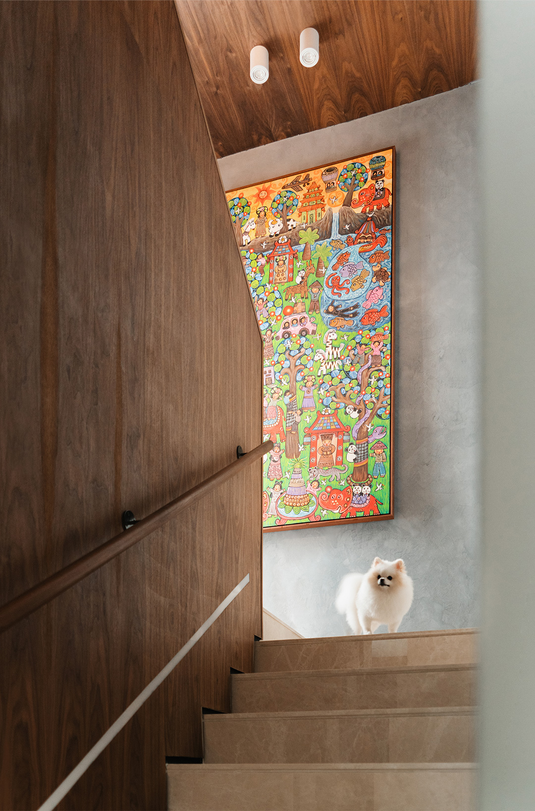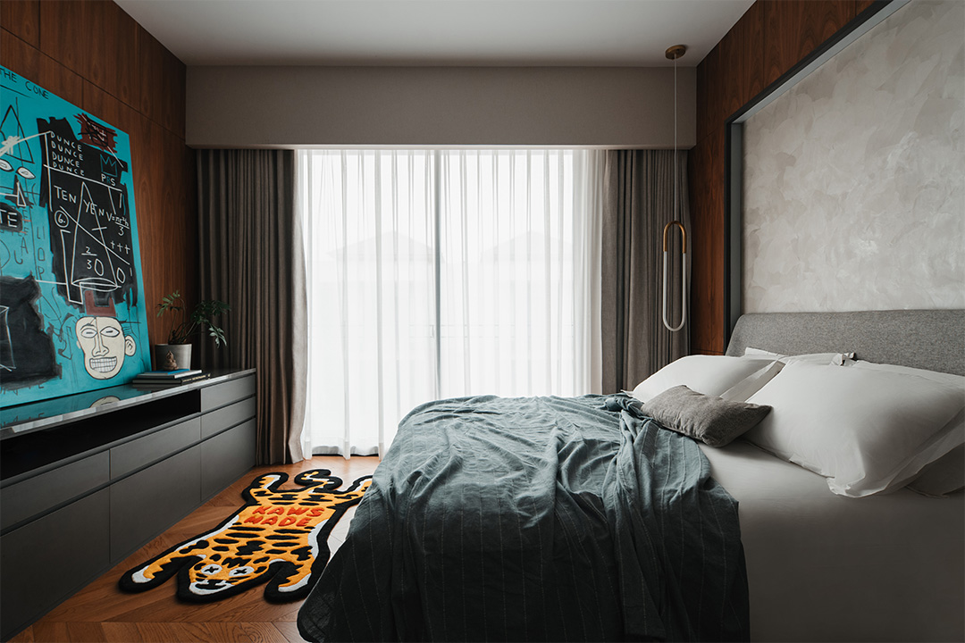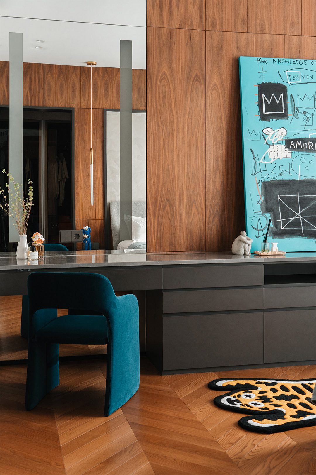 除了玩偶,各空间墙面上还装点着多幅色彩鲜艳、复杂交错的现代挂画。客厅的卡通画趣味十足,楼梯间和餐厅的数字油画极具本地民俗特色。而卧室柜子上则摆放了一幅来自已故法国涂鸦艺术家让·米歇尔·巴斯奎特(Jean-Michel Basquiat)于1982年创作的艺术作品《Equals Pi》,蒂芙尼蓝背景下的涂鸦元素为恬静的空间增添了一丝不羁的张扬和悸动。