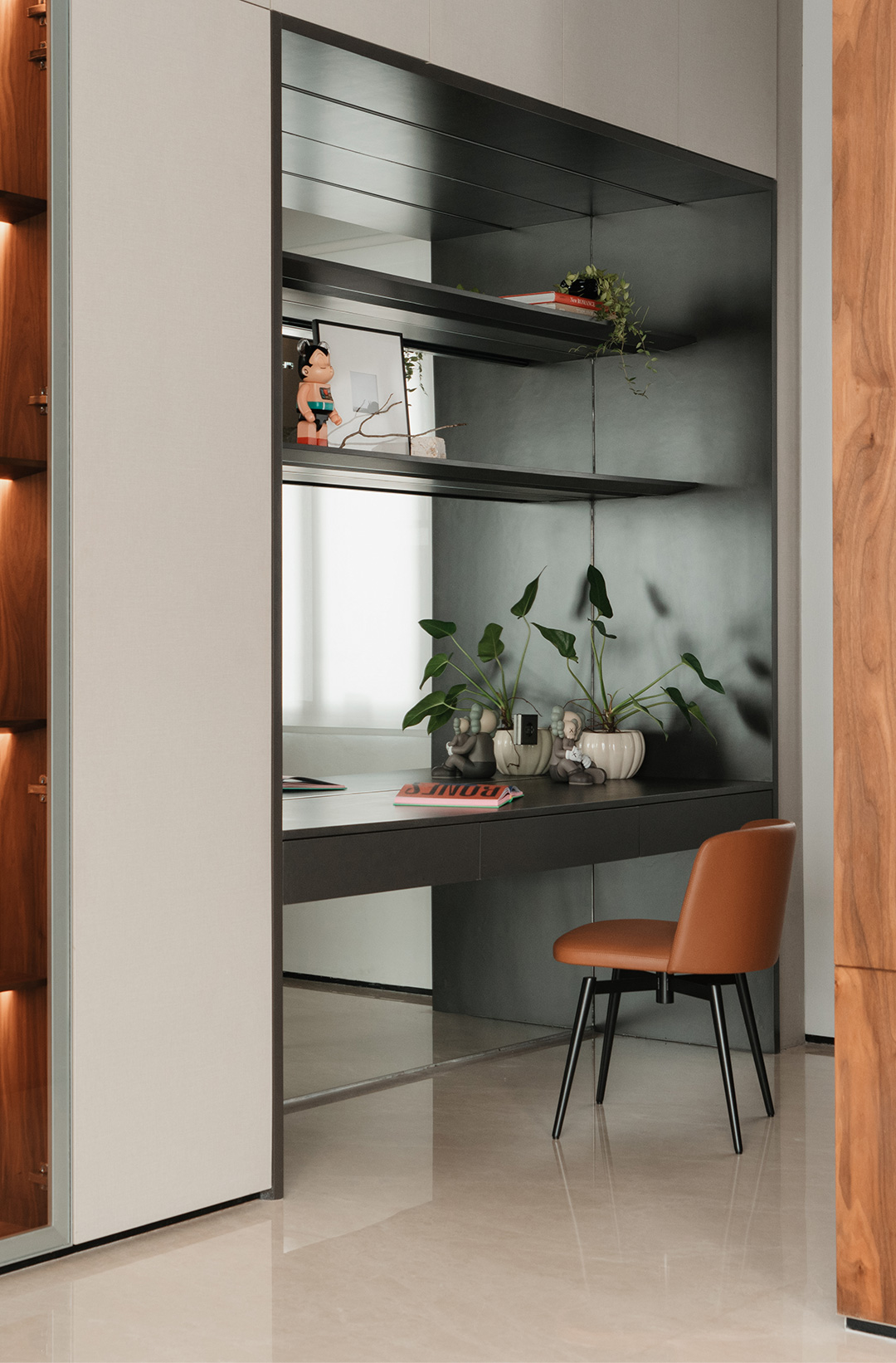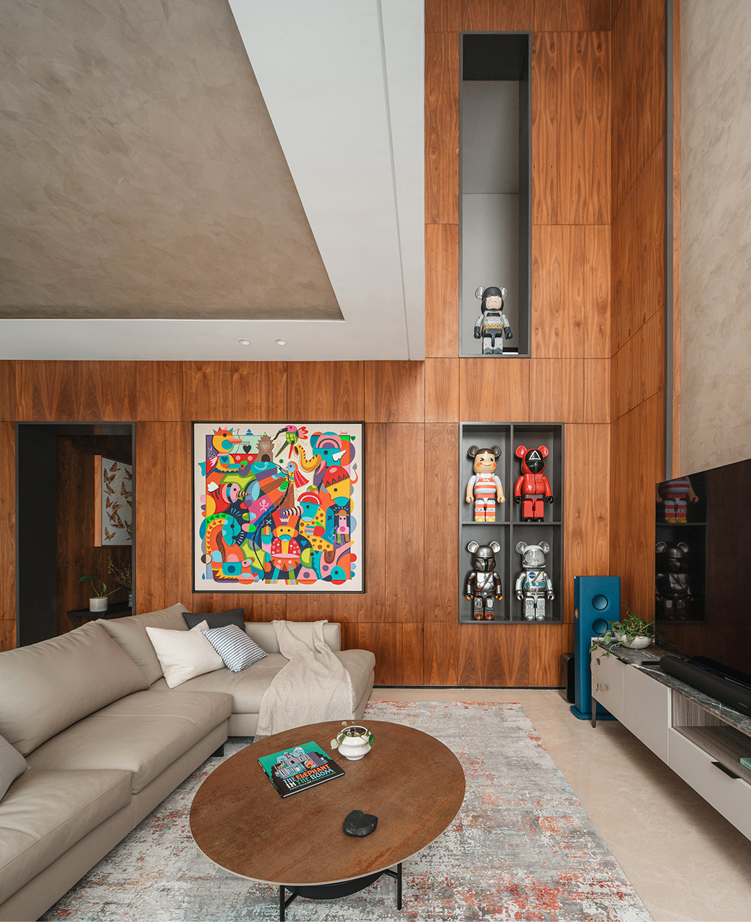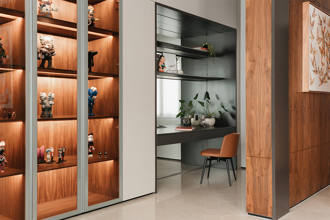 然而,当你的目光扫过客厅的墙面,你会立刻掉入一个潮玩天地!一个个造型各异、大小不同、充满奇思妙想的玩偶手办占满了整面墙。从积木熊,到Kaws和防弹少年团的公仔,甚至泡泡玛特的MOLLY珍藏版……它们像是从潮流宇宙穿越而来的精灵,在这古朴的空间中瞬间注入来自异次元的神秘活力。
