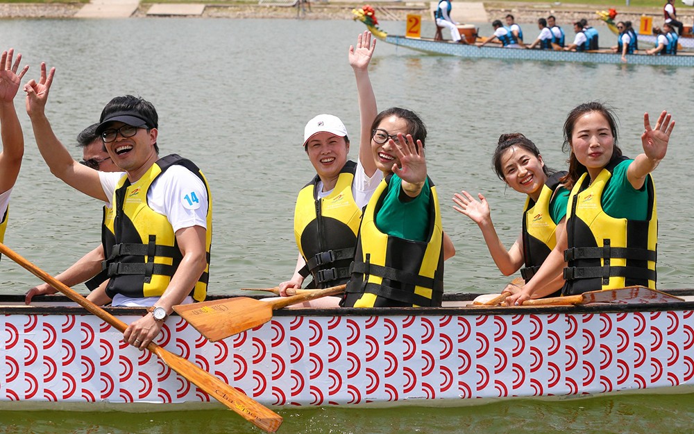 个人重修身,团队重协作!当心凝聚在一起的时候,统一了所有的船桨,它们步调一致地在水面上摆动着,每艘龙舟都在团结拼搏的精神推动下,行稳致远……